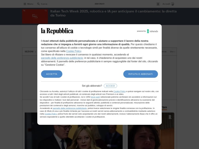 Website Title: la Repubblica – News in tempo reale – Le notizie e i video di politica, cronaca, economia, sport. Main topic: Italian Tech Week 2025, robotica e IA per anticipare il cambiamento: la diretta da Torino.